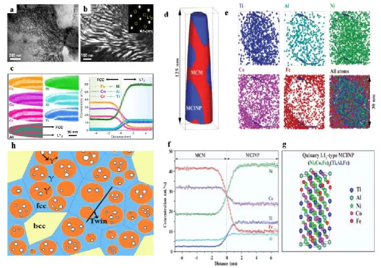 图五 具有复杂结构的三种纳米沉淀相的空间形态、多组分性质和示意图。a) TEM-明场图像显示了(Ni1.5FeCoCr0.5)87.5Al7.5Ti5.0 HEA中纳米层状结构的形貌。b)暗场图像显示纳米片层具有L12结构。c) APT表明纳米层状结构主要由Ni3(Al,Ti)组成。d) APT的三维重建,显示(FeCoNi)86A17Ti7合金中的纳米复合显微结构。e) 对应的3D-APT原子图显示了典型L12沉淀相中的原子分布。f) 通过基体和纳米颗粒的近直方图揭示了MCINPs的多组分性质。g) 通过(FeCoNi)86A17Ti7合金的(DFT)计算,对L12 MCINP的晶体结构和位置占有率进行排序。h) 由γ基体(蓝色)和层状晶内沉淀物(即原生γ’沉淀物(橙色))组成的显微结构示意图。次级γ*沉淀相(白色)位于初级γ‘沉淀相中。