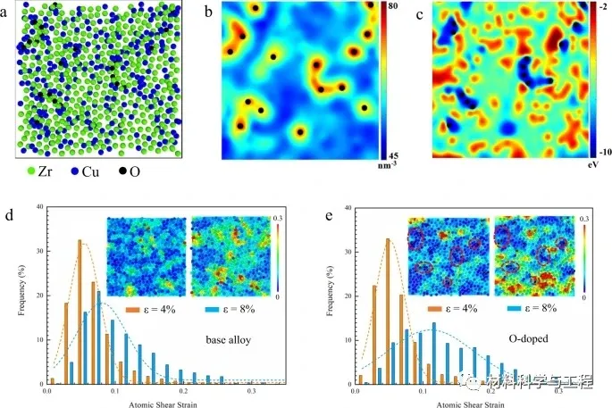 图5 基合金和O掺杂合金的局部原子堆积和剪切响应的MD模拟。