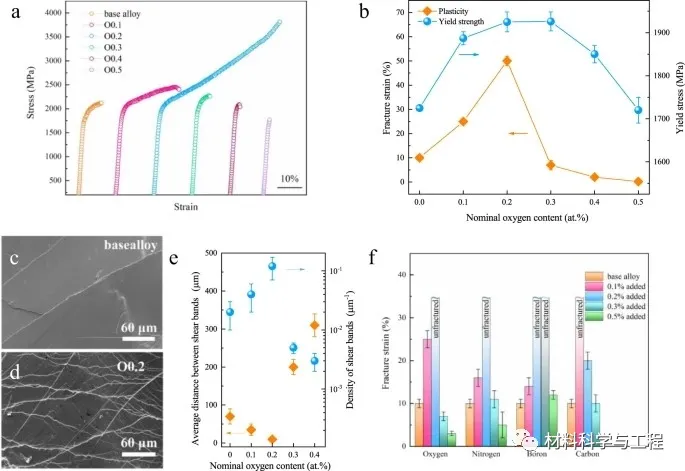 综上所述,目前的研究结果表明了如何通过不同的设计概念成功地克服BMGs的室温脆性。这是通过形成塑料顺应区,形成周围的密集填充团簇包含间隙掺杂剂。在这种方法中,小的间隙原子被称为“簇形成者”,因为它们体积小,热力学上的考虑,以及它们部分的共价键贡献。由此产生的结构不均一性的增加被证明是大幅度提高BMGs塑性的有效方法,在没有损失的情况下,而是在强度上增加。因此,适当掺杂氧、硼、碳、氮等NMEs,可以同时提高塑性、强度、热稳定性,甚至增强GFA。这种组合在玻璃成型、可塑性、强度和成本之间取得了良好的平衡,为符合塑料和耐损伤的BMGs开辟了全新的合成、加工和应用范围。