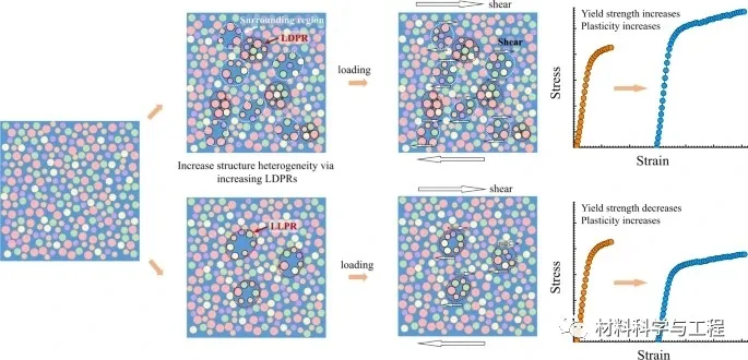 在远低于玻璃化转变温度的BMGs中,塑性变形主要是由于局部扩散跃迁或被称为剪切转变区(shear transformation zone, STZs)的原子团簇的局部共同剪切事件,即一组原子共同克服了局部原子重排的能量势垒鞍点。变形能力源于金属键合所固有的灵活性:离域电子允许金属原子在彼此之间滑动而不受键合断裂的影响,而键合断裂有利于损伤而非剪切,例如在离子玻璃中。尽管局部剪切转变开始的位置仍然难以预测,但人们普遍认为,在BMGs中引入更松散的填充区域,可以有效地促进局部塑性事件。这些区域具有较高的局部势能,在加载时容易发生非弹性变形,表现为类液体行为。因此,增加松散填充区域的数量,可以有效地提高BMGs的塑性。