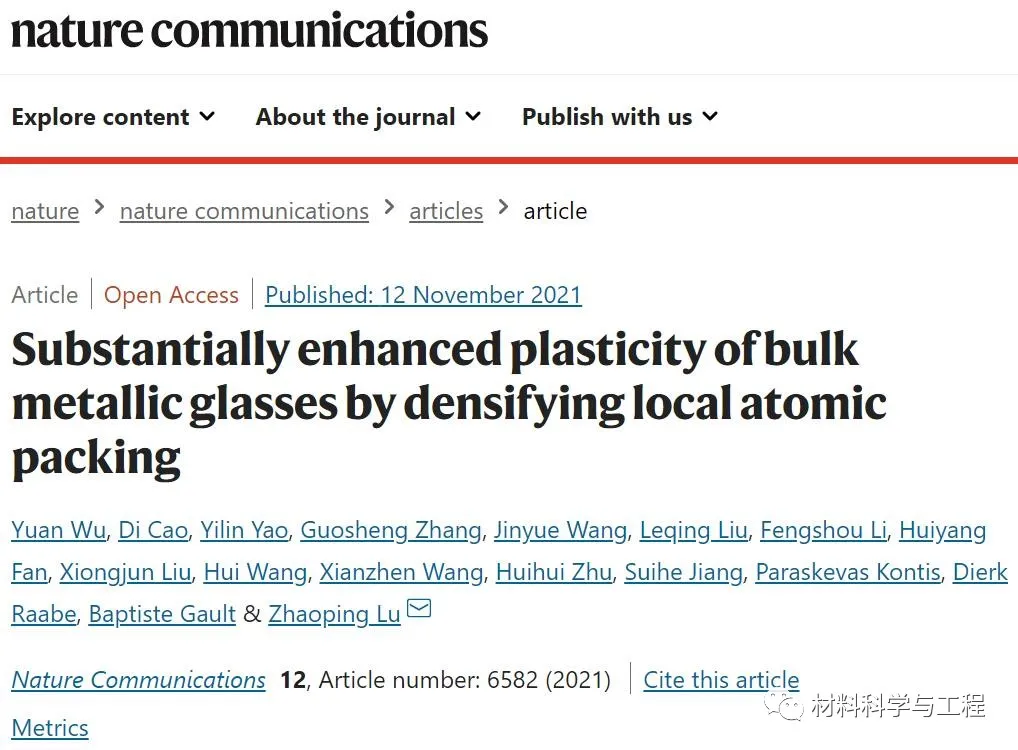 在块状金属玻璃(BMGs)中引入更松散的原子堆积区域,可以促进塑性变形,使BMGs在室温下更具延展性。在此,来自北京科技大学的吕昭平等研究者,提出了一种不同的合金设计方法,即掺杂非金属元素形成密集的填充图案。相关论文以题为“Substantially enhanced plasticity of bulk metallic glasses by densifying local atomic packing”发表在Nature Communications上。