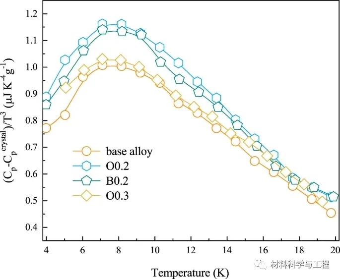 图3 研究了基合金和O0.2、B0.2、O0.3掺杂合金的低温比热容实验数据。