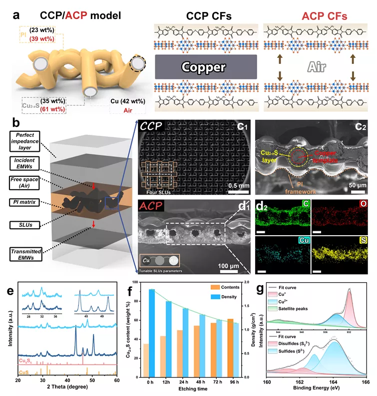 Air@Cu2-xS@PI (ACP) 薄膜的主要设计路线如下图所示(图1a)。在构建过程中,以含氟PI薄膜作为框架,并使用市售的铜网作为原材料和模板,通过表面活化、原位配位反应、硫化、浸胶、亚胺化、选择性蚀刻等一系列操作,成功制备出具有周期性损耗单元的聚酰亚胺中空复合薄膜。化学结构表征证实聚酰亚胺框架在酸性刻蚀剂中可以保持长时间稳定,刻蚀后的薄膜继承了聚酰亚胺柔韧的特性并由于氟离子的引入表现出一定的透明度(图1b-d)。同时,由于聚酰亚胺框架的锚定作用,铜网本身的周期性方环结构在原位配位反应、硫化和蚀刻处理后也得以保留,经过有限元分析证明该结构在交变电磁场下对薄膜电场分布产生积极影响(图2a, b)。通过控制硫化参数进一步优化了每个周期单元的微观结构和组分,最终得到了由中空内核和多孔Cu2-xS(CuS, Cu9S5)外层组成的电磁波衰减单元(图2c-g)。