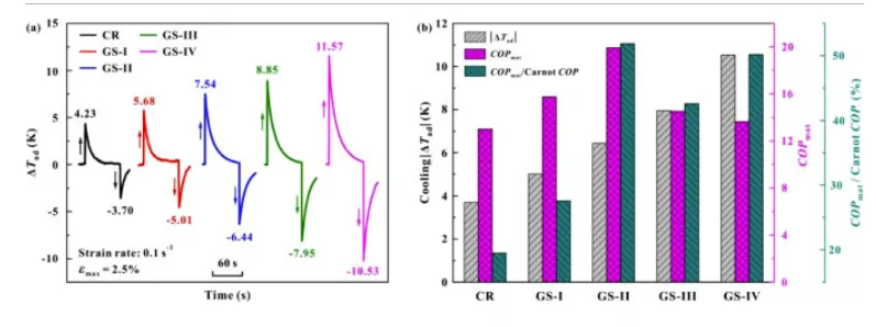 图 9。梯度结构 (GS) 和均匀粗晶 (CG) NiTi 之间的弹热冷却性能比较。