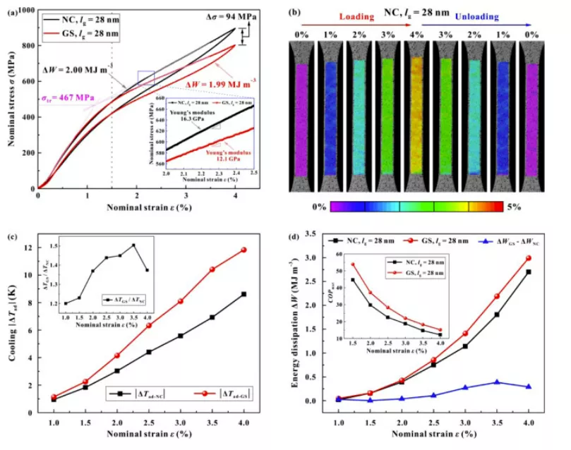 图 8。梯度结构 (GS) 和均质纳米晶 (NC) NiTi 之间的热机械性能比较。(a) 单轴拉伸应力-应变曲线。(b) NC NiTi 正向和反向相变过程中的应变分布。(c) 绝热冷却温度下降和 (d) 能量耗散随施加应变的变化。(c) 和 (d) 中的插图分别显示了ΔT GS / ΔT NC和COP mat 的相应变化。