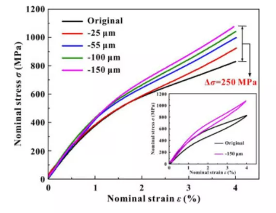 图 6。从梯度结构 (GS) 试样的两侧去除表面层的拉伸应力-应变曲线。图例表示两侧的层厚度减少。