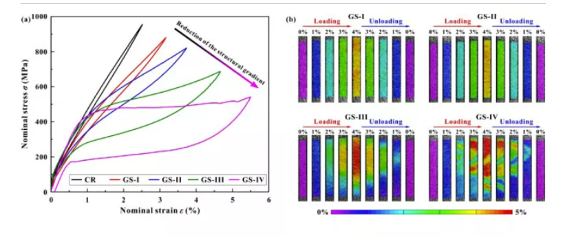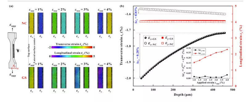 图 11。梯度结构 (GS) 和均质纳米晶 (NC) NiTi 之间侧面应变分布的比较。(a) 横向应变ε x(左)和纵向应变ε y(右)在不同施加应变ε app 下的局部应变分布。(b) ε app = 4% 时GS 和 NC NiTi 侧面的应变分布。插图展示了不同ε app 下的横向应变差 Δ ε x。