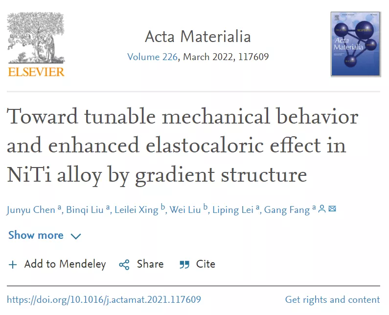 通过微结构设计制造具有可调和卓越性能的金属以满足日益增长的应用需求一直是材料科学家的不懈追求。迄今为止,人们一直致力于通过晶界强化、析出强化和固溶强化等传统策略来改善金属材料的力学性能。不幸的是,具有均匀微观结构的制造材料通常要么坚固要么具有延展性,并且可控性有限 。这是大多数实验室开发的产品没有广泛商业化用于工业应用的主要原因。最近,人类从大自然中汲取智慧,生产出各种具有渐变微观结构的仿生梯度结构 (GS) 材料,以实现优异的强度-延展性协同作用和增强的耐久性。然而,现有关于梯度结构的研究仅集中在传统金属材料上,制造 GS形状记忆合金的可行策略(SMA)仍然不可用。此外, SMA的跨尺度马氏体转变行为,尤其是微观结构梯度对机械响应和相关的弹性热效应的影响,尚不清楚。开拓这一未知领域对未来制造业和材料优化具有学术和现实意义。