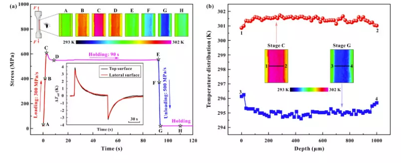 图 10。梯度结构 (GS) NiTi 侧表面的热成像。(a) 不同负载阶段的一系列放大局部温度曲线。剖面 A 中的红色虚线表示试样边缘。插图显示了顶部(激光处理)和侧表面的平均温度随时间的变化。(b) 绝热加载 (C) 和卸载 (G) 阶段横向表面的温度分布。黑色实线(1-2 和 3-4)横跨样品的整个厚度。