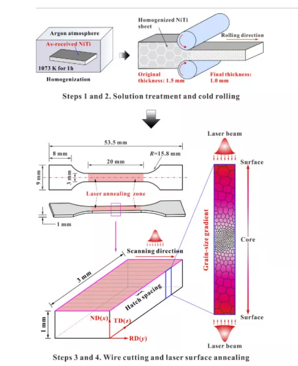 导读:定制工程材料的性能以满足各种应用要求是材料科学中长期存在的挑战。本文展示了一种前所未有的策略,通过在严重变形的基体上通过激光表面退火制造梯度结构,在超弹性 NiTi 中实现高度可调的机械行为和显著增强的弹热效应。梯度结构 (GS) NiTi 片的特点是纳米晶芯夹在两个粗晶粒层之间,由于热渗透的自然退化,通过在厚度内进行渐进退火,实现了晶粒尺寸梯度。可定制的马氏体转变特征,从具有准线性应力-应变响应的均匀模式逐渐转变为具有平台型超弹性的成核和生长模式, 通过调整粒度梯度很容易实现。此外,与具有均匀微观结构的传统纳米晶和粗晶 NiTi 相比,GS NiTi 的弹热冷却能力和效率分别提高了 50% 和 130% 以上。