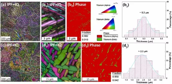 图3.IPF+IQ映射和相位映射(a,b)1- c2)AS和(c,d1- e2HTPBF-LBTi6Al4V,(a,c)中的破折号表示先前β相界;(b)中α `/α相的厚度3)AS和(d3)HTPBF-LBTi6Al4V