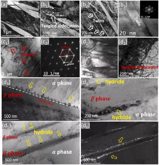 图 12.透射电镜图像和相关衍射图:1) 未充电 AS PBF-LB Ti6Al4V, (b1-乙3) 96 小时 H 充电 AS PBF-LB Ti6Al4V 具有约 3% 的应变;(丙)1,c2) 未充电 HT PBF-LB Ti6Al4V,(d1-d6) 96 小时 H 充电 HT PBF-LB Ti6Al4V,应变约 3%,(d6) 是暗场视图