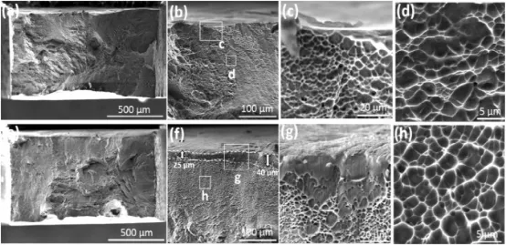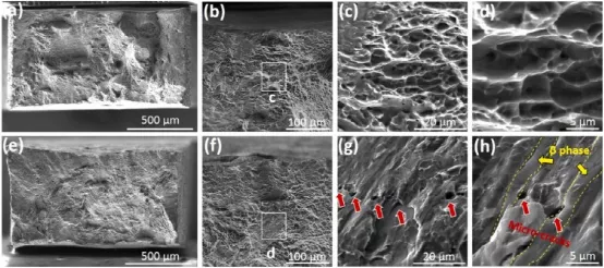 图14.HT PBF-LB Ti6Al4V合金不同放大倍率的宏观和详细断裂形态:(a-d)在H充注之前和(e-h)之后,黄色箭头表示β相,红色箭头表示α/β界面处的微裂纹