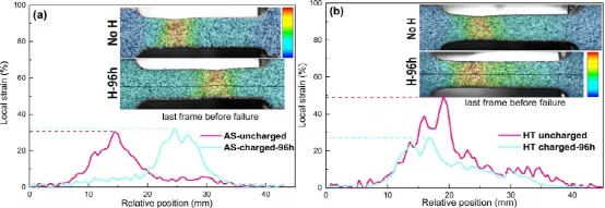 图8.(a) 使用和不带 H 充电的情况下,工程应变分布与故障前最后一帧的应变距离的关系:(a) AS 和 (b) HT PBF-LB Ti6Al4V,插值是失效前最后一帧的应变图