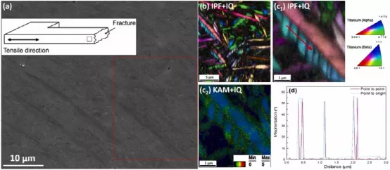 图10.(a) AS PBF-LB Ti6Al4V用H充填(96 h)拉伸试验后断裂的侧视图及相关EBSD结果:(b, c 1) 具有不同放大倍率的 IPF+IQ 映射,(c2)KAM + IQ映射和(d)沿着(c)线的错误定向演变1)。扫描步骤为40 nm