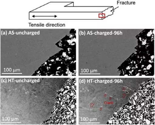 图9.对于(a,b)AS和(c,d)HT PBF-LB Ti6Al4V,在拉伸试验(96小时)下,有和不带H充注(96小时)的裂缝侧视图,(d)中的箭头表示裂缝附近的微裂纹