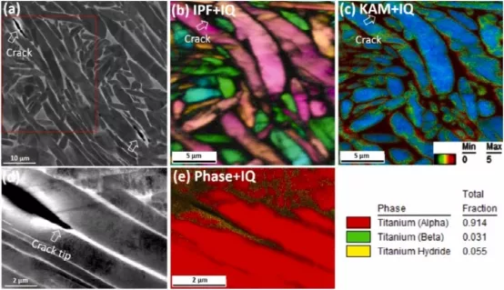 图11.(a,d)HT PBF-LB Ti6Al4V 用 H 充填(96 h)进行拉伸试验后裂缝的侧视图以及相关的EBSD结果:(b)IPF+IQ 图、(c)KAM+IQ 图和(d)Phase+IQ 图。扫描步骤为40 nm
