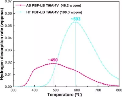 图5.AS和HT PBF-LB Ti6Al4V合金在-1 mA/cm进行H充电后的氢气解吸速率与加热温度的关系296 h,升温速率为6°C/min
