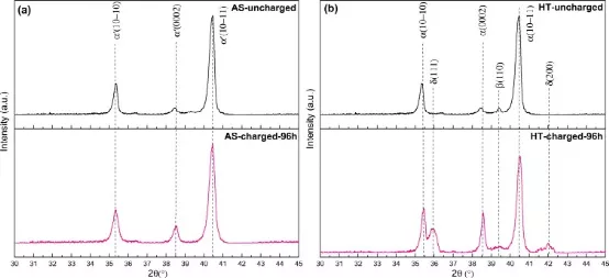 图6.在96 h-H充电之前和之后(a)AS和(b)HT PBF-LB Ti6Al4V的XRD模式中,应该注意的是,由于氢扩散系数低,样品表面的钛氢化物含量将高于内部。