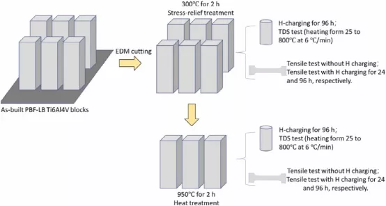 最近,Metalnikov等人证实在电化学和气体充氢后,在电子束粉末床熔合(PBF-EB)Ti6Al4V合金(层状 α β 结构)上形成氢化物,氢化后样品表面没有观察到裂纹,表明改进的与传统制造部件相比的HE电阻(等轴和层状区域的双峰微观结构)有所改善。此外,由于氢侵入下的显微组织细化和二次相析出物的形成,进一步证实了 PBF-EB Ti6Al4V 的耐磨性降低和硬度增加。这些现象表明HE行为受到钛合金初始微观结构的显着影响。对于通过激光束粉末制造的 Ti6Al4V床融合(PBF-LB1),微观结构呈现出几乎完整的α/α′相并且没有与氢环境中的机械响应以及后热处理效应相关的现有文献。