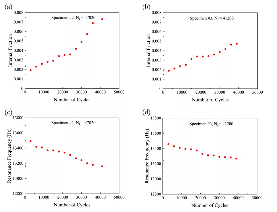 图2. 另外2个铝合金样品在疲劳过程中的内耗和共振频率变化