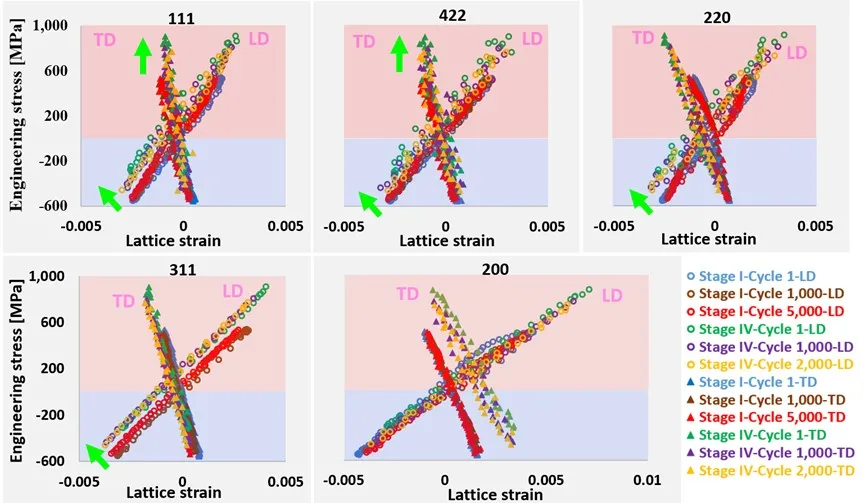 同时,疲劳损伤和晶粒的晶体学取向密切关联。通过大量实验对比,发现在加载轴和垂直于加载轴方向,某些特定取向的晶粒信息可以反映疲劳损伤。如图5所示,拉伸时,在垂直于加载轴的方向,111和422点阵应变可以表征和反映材料的损伤程度。压缩时,沿着加载方向,111,422, 311,220点阵应变可以反映疲劳损伤。但是由于拉伸和压缩过程中,裂纹扩展在前者是有利的,而在后者会被抑制。因此,对于拉/压疲劳的不同阶段,表征疲劳损伤程度,需要沿不同方向,采用不同的点阵应变来表征。详细规律见参考文献2。