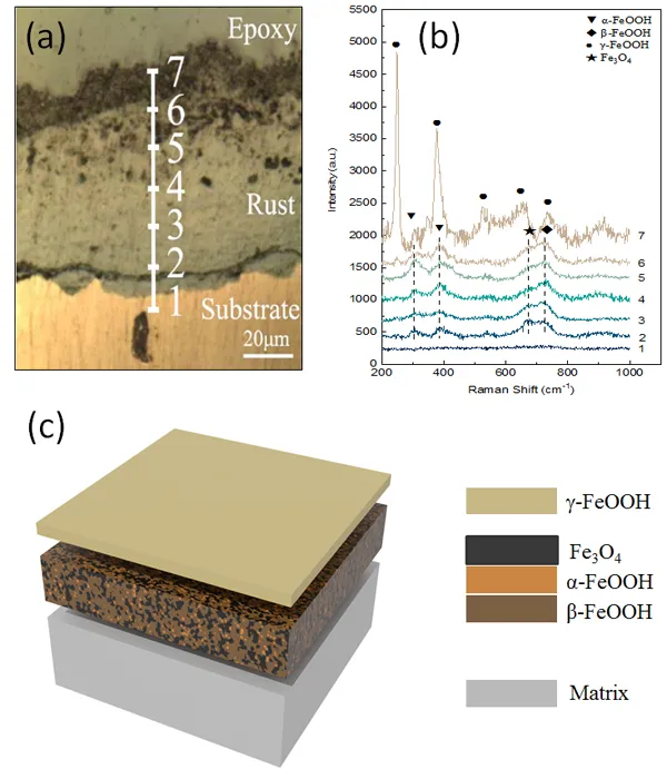 图2. Q235钢在模拟海岸大气环境下60CCT后的锈层截面拉曼光谱及锈层深度方向上的成分结构示意图,(a) 拉曼光谱作用位置,(b) 锈层截面的拉曼光谱,(c)锈层深度方向上的成分结构示意图