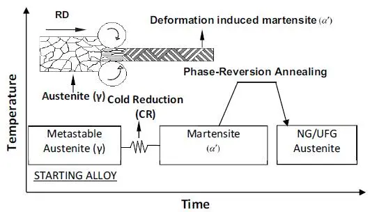 针对奥氏体不锈钢屈服强度偏低这一不足,东北大学轧制技术及连轧自动化国家重点实验室杜林秀教授团队以304不锈钢为研究对象,基于前期研究基础并结合企业当前工艺装备条件,利用变形诱导马氏体相变及逆相变退火的耦合作用并结合循环相变细晶原理,提出通过热轧-冷轧-退火一体化控制,利用多阶段冷轧-退火工艺实现实验钢的组织纳米/亚微米化,将屈服强度提高了约3~4倍。