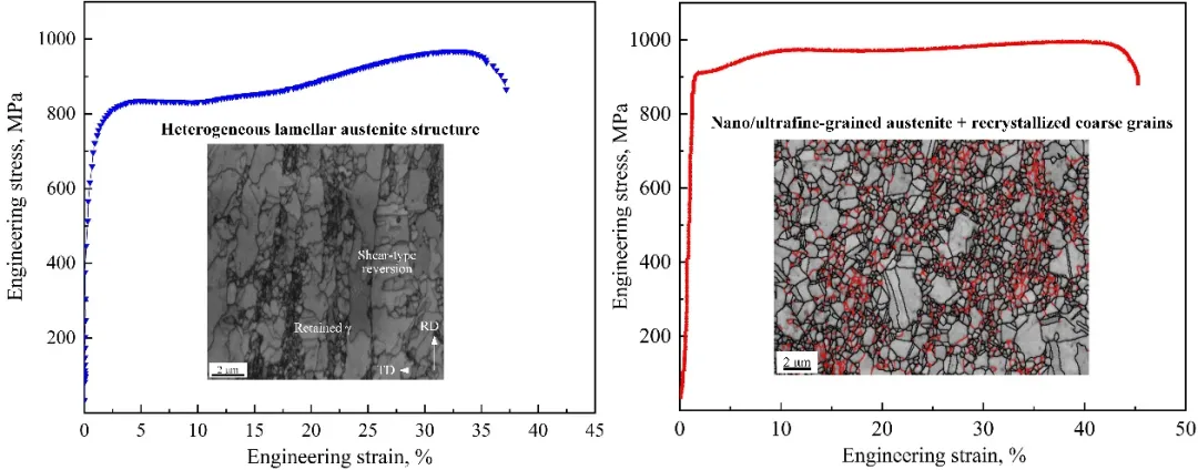 1、研究了加热速率对马氏体→奥氏体逆相变机制的影响,发现加热速率<10°C/s,逆相变机制为扩散型,形成100~500nm的等轴奥氏体;加热速率>40°C/s,逆相变机制为切变型,形成高位错密度的不均匀层状组织,使材料具有高强塑性。