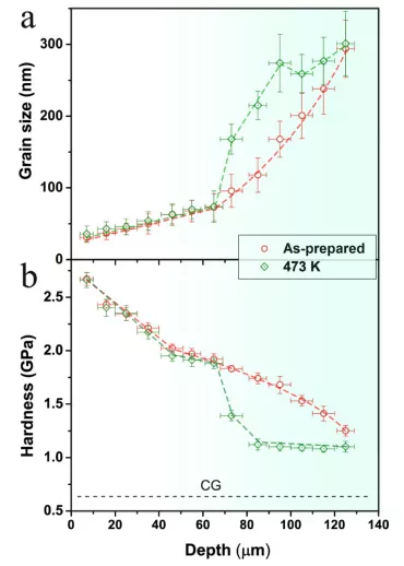图8所示为(在473 K,30 分钟条件下)对于所制备和退火的 SMGT Al-5Mg 样品,晶粒尺寸 (a) 和维氏硬度 (b) 随距离表面深度的变化,在 (b) 中也显示了CG 的硬度,以进行比较CG 的硬度(如图所示用虚线)。