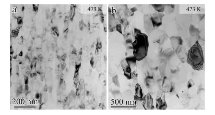 图7所示为在 473 K 退火 30 分钟的 SMGT Al-5Mg 样品的纳米晶粒 (a) 和亚微米晶粒 (b) 的典型明场横截面TEM图像