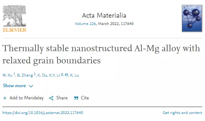 中国科学院金属研究所卢柯院士团队通过在纳米尺度上利用晶界松弛来强化Al-Mg合金。利用Al-5Mg合金在非常高应变速率下的低温塑性变形,成功地诱导高密度GBs松弛进入低能态,形成了成分消耗,而不是分离。所得纳米晶Al-5Mg合金具有高硬度和优异的热稳定性,克服了普通铝二元合金在强度和热稳定性之间的平衡。相关研究成果以题为“Thermally stable nanostructured Al-Mg alloy with relaxed grain boundaries”发表在金属顶刊Acta Materialia上。