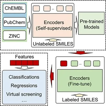 由于分子结构的复杂性,特征提取一直是分子预测课题中的关键。有监督机器学习模型需要大量的标签数据,但这在实际中往往难以实现,这导致训练只能在小而分散的数据集上进行。本研究发展了一套自监督学习方法,对各个数据库中总计七亿个无标签的小分子进行预训练,从特定任务中的分子序列提取特征。通过不同数据集的结合构建了三个模型,进而说明无标签分子自监督学习的重要性。本文还提出了基于数据特征自动化针对特定任务选取最优模型的方法。该研究以“Extracting Predictive Representations from Hundreds of Millions of Molecules”为题发表在Journal of Physical Chemistry Letters上。DOI:10.1021/acs.jpclett.1c03058。