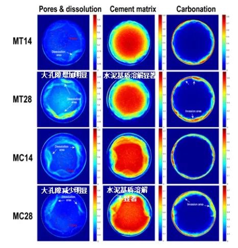 井筒水泥对照组(MT)和改性组(MC)CO2腐蚀后大孔隙、水泥基质、碳化层分布图