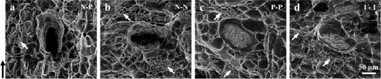 图 6.对N-P(a),N-N(b),P-P(c)和I-I(d)的微观分形特征的扫描电镜观察。粗糙的酒窝(由白色虚线勾勒)清楚地出现在中等酒窝的均匀背景上。此外,在中等酒窝之间还发现了少量细小的酒窝(用白色箭头表示)。