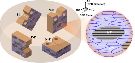 图 1.CT标本及其在DPD盘中的方向示意图。微观结构组件,即纳米孪生(NT)和细长纳米颗粒(NG)也示意性地示意性地说明了每个样品的横截面。此外,右侧的放大图像更清楚地显示了微观结构(绘制不按比例)。