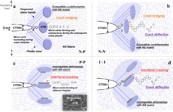 通过一系列研究,研究了 NTB 在 HNS 金属中的增韧效果,这表明 NTB 不仅在本质上增强通过抑制应变局部化和空洞形核来提高裂纹尖端的塑性,但也可以作为裂纹前沿后面的裂纹桥,并通过屏蔽裂纹尖端来外部抵抗断裂。与传统复合材料中元素的硬度和弹性/塑性变形的巨大差异(例如,独特的硬第二相和软基体)相比,由于两者之间的不匹配,损伤总是从硬/软界面开始。坚硬但可变形的NTBs不仅能适应塑性应变,约束NG基质中的损伤成核,还能促进界面处的有效应变传递,从而抑制界面开裂。
