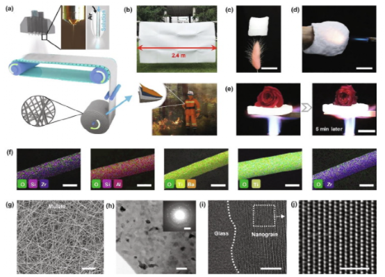 图 1。海绵陶瓷的制造、形态及保温前景。(a) 示意图显示了溶液吹纺 (SBS) 的设置、成丝过程和消防服的潜力。(b) 方形陶瓷海绵的大比例照片。(c) 1-cm 3莫来石海绵自由站立在狗尾草的尖端,突出它们的超轻性质。比例尺,1 厘米。(d) 1 厘米厚的海绵对其他未受保护的手具有显着的隔热性能。比例尺,5 厘米。(e) 1 cm 厚莫来石海绵的照片在丁烷加热下可有效防止鲜花凋谢至少 5 分钟 喷灯(~1,300 °C)。比例尺,5 厘米。(f) ZrO 2 ·SiO 2 、硅线石(Al 2 SiO 5 )、钛酸钡(BaTiO 3 )、二氧化钛(TiO 2 )和氧化锆(ZrO 2 )陶瓷纤维的能量色散X射线光谱(EDS)图。 比例尺,500 nm。(g) 莫来石海绵表面的扫描电子显微镜 (SEM) 图像。比例尺,300 μm。(h) 显示纳米颗粒的明场透射电子显微镜 (BF-TEM) 图像结构体。比例尺,50 nm。(插图)莫来石纤维的选区电子衍射图,点-晕混合结构表明莫来石纤维由结晶和无定形部分组成。比例尺,5 1/nm。(i) 像差校正的高角度环形暗场扫描 TEM (HAADF-STEM) 图像显示了莫来石纤维的纳米颗粒-玻璃双相结构。比例尺,5 nm。(j) 莫来石纤维中晶体部分的 HAADF-STEM 扩大。比例尺,2 nm。