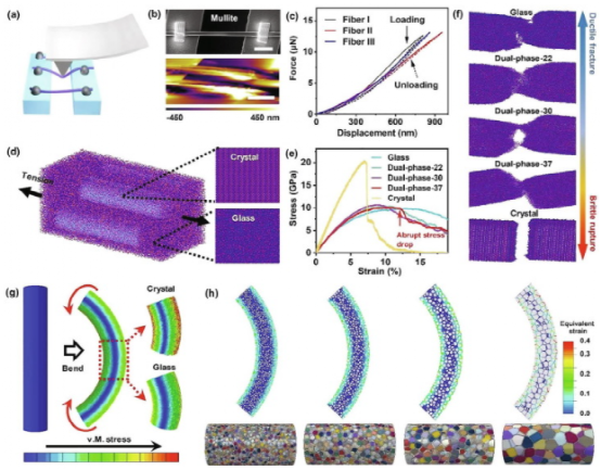 图 2。单纤维的机械性能。(a)使用原子力显微镜(AFM) 尖端进行横向弯曲试验的固定莫来石纤维示意图。(b)悬浮在沟槽硅晶片上的单根纳米纤维的 SEM(顶部)和 AFM(底部)图像。比例尺,5 μm。(c) 弹性操纵过程中记录的力-位移曲线。( d )具有嵌入圆柱形结晶区域的NGDP样品配置。(e)单轴拉伸下不同晶体体积的玻璃、纯晶和双相莫来石陶瓷的应力与应变曲线。(F)随着晶体体积比从 0% 增加到 100% ,各种陶瓷系统的断裂形态突出了从韧性断裂向脆性断裂的转变。(g)双相 30 光纤的有限元模拟,显示晶体和玻璃相中的von Mises 应力分布。内拱和外拱中的晶相表现出比玻璃相强得多的应力集中。(h) 当弯曲到相同曲率半径(2.0 μm)时,具有不同晶体体积比 (29.0%、38.2%、47.8% 和 77.1%) 的双相莫来石纤维中玻璃相的等效应变图。