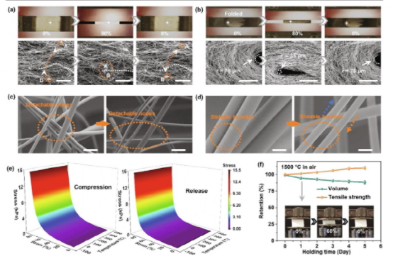 图 4。莫来石海绵的变形机理和不随温度变化的超弹性。(a)完整压缩释放周期的原位SEM 图像叠加和标记区域的放大图。红色和白色箭头分别标记相同点和亚微米纤维的移动轨迹。比例尺,300 μm。(b)原位SEM弯曲测试的快照和标记区域的放大图。比例尺,300 μm。(c) SEM 图像显示节点的压缩和解压缩。比例尺,2 μm。(e) 显示束滑动的 SEM 图像。比例尺,500 nm。(e)应力依赖性的 3D 表面图关于应变和温度。(f)在长期高温条件下处理后的体积和拉伸强度变化。(插图)在 1,500 °C 下处理 1 天后εC的一个压缩循环的照片