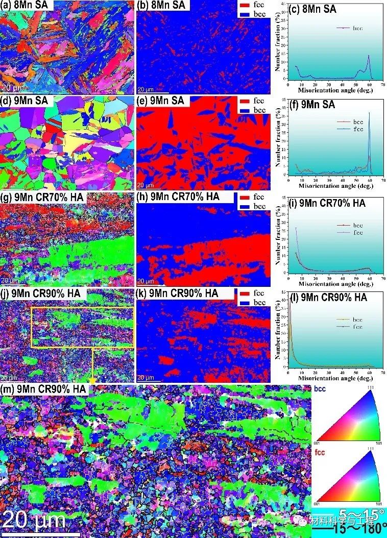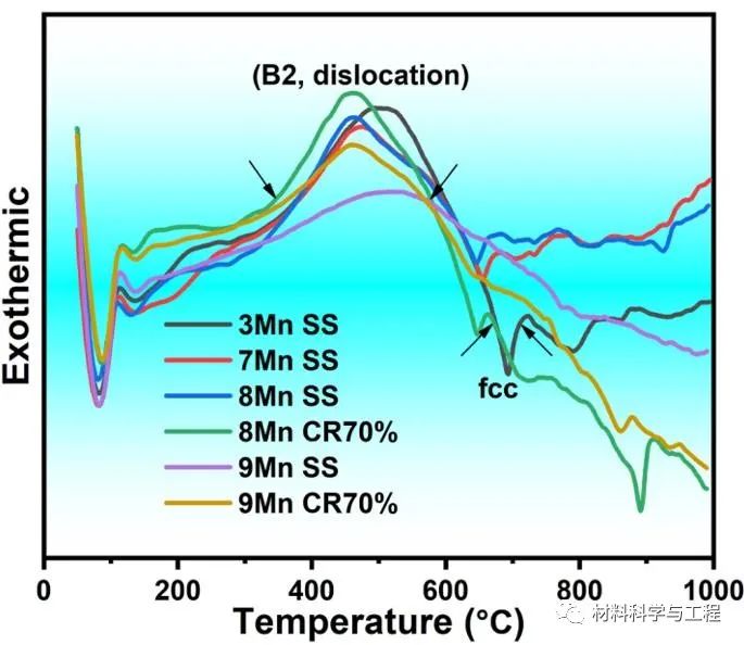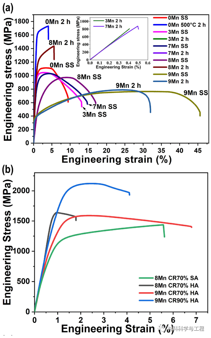 研究发现对于固溶(SS)淬火后的时效(软态时效,SA),要实现体心立方基体中B2的析出,奥氏体相的含量应小于体心立方相分数。对于奥氏体体积分数大于50%的9Mn合金,软态时效过程中奥氏体逆转变阻碍B2的析出,图7显示DSC分析的放热峰和吸热峰分别对应于B2析出和奥氏体回复,9Mn SS样品两个峰重叠,导致几乎没有沉淀硬化效应,导致软态时效强度较低。冷轧过程中储存的晶体缺陷增强了B2析出,导致9Mn HA样品的析出强化效果显著。从而获得了超高的极限强度(~1600 MPa),拉伸塑性(~7%)比软态时效合金(~1450 MPa和~5%)有所提高。这项工作表明,通过添加锰和硬态时效来提高超高强度钢的塑性是一种比较有前景的策略。