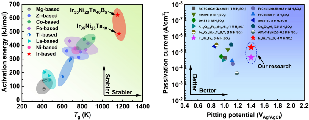 图1 左图为Ir-Ni-Ta-(B)非晶态合金与其他合金体系的晶化活化能对比图;右图为不同材料在硫酸溶液中的点蚀电位和钝化电流对比图