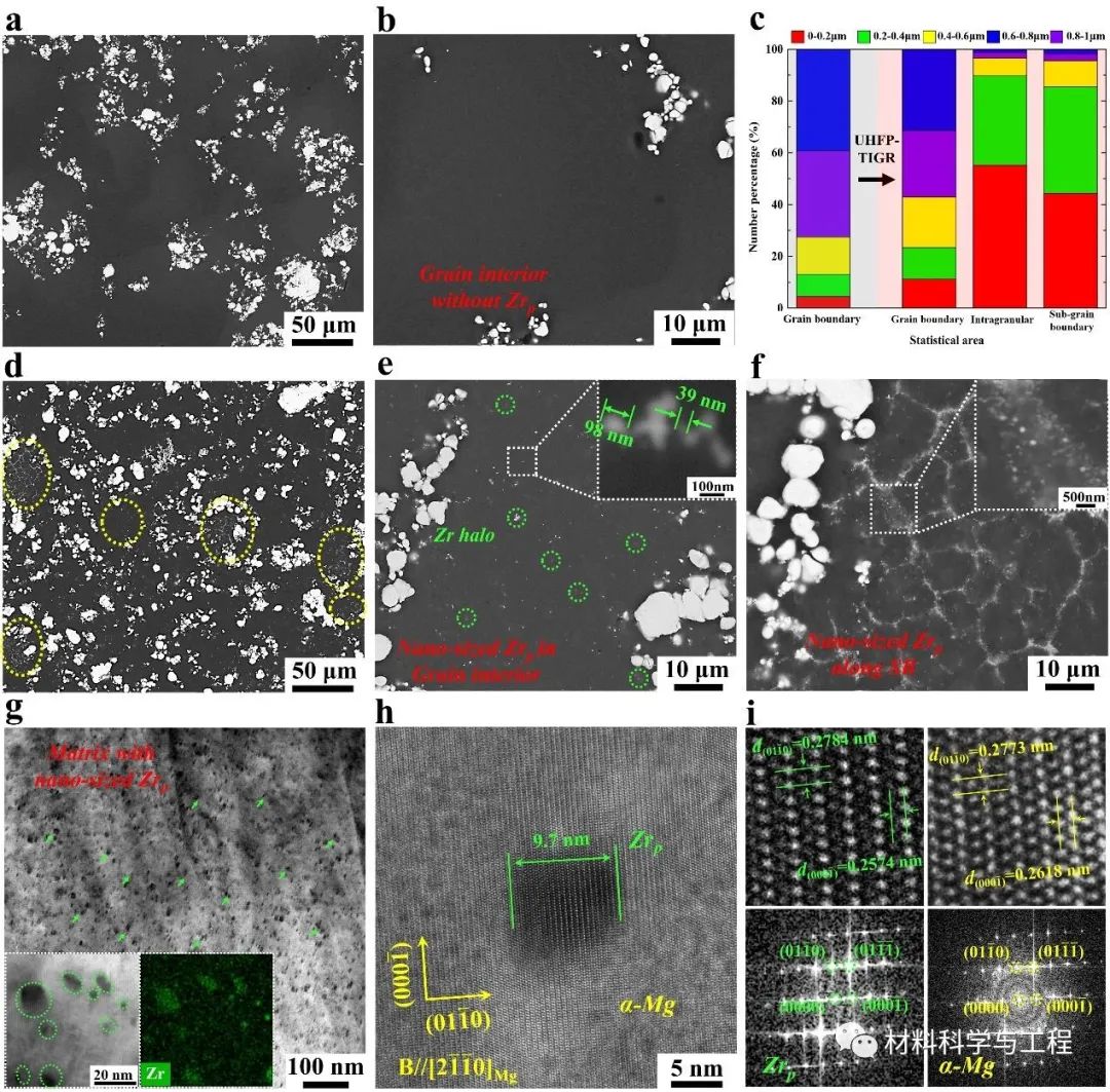 在该研究中,吴国华教授团队创新地提出了一种Mg-Zr中间合金晶粒细化剂预处理方法,通过采用超高频脉冲重熔对Zr晶粒细化剂进行预处理,显著改善了Zr晶粒细化剂的组织均匀性及其细化效果。研究发现,该预处理方法不仅能够大幅提高Mg-Zr中间合金晶粒细化剂中溶质Zr的含量,还能促进大量纳米级(数纳米到数百纳米)Zr粒的过饱和析出,显著细化了细化剂的Zr粒尺寸。基于Mg-Zr中间合金晶粒细化剂的组织遗传性,揭示了Mg-Zr中间合金在预处理过程中的组织演变机制,结合基体与形核核心的界面冶金反应的热力学条件,探明了Mg-Zr中间合金中纳米级Zr对晶体生长的抑制效应与异质形核的影响规律,为高效晶粒细化剂的设计和制备提出了新思路。细化实验验证表明,该研究所提出的预处理工艺大幅度提高了镁稀土合金的晶粒细化效果。