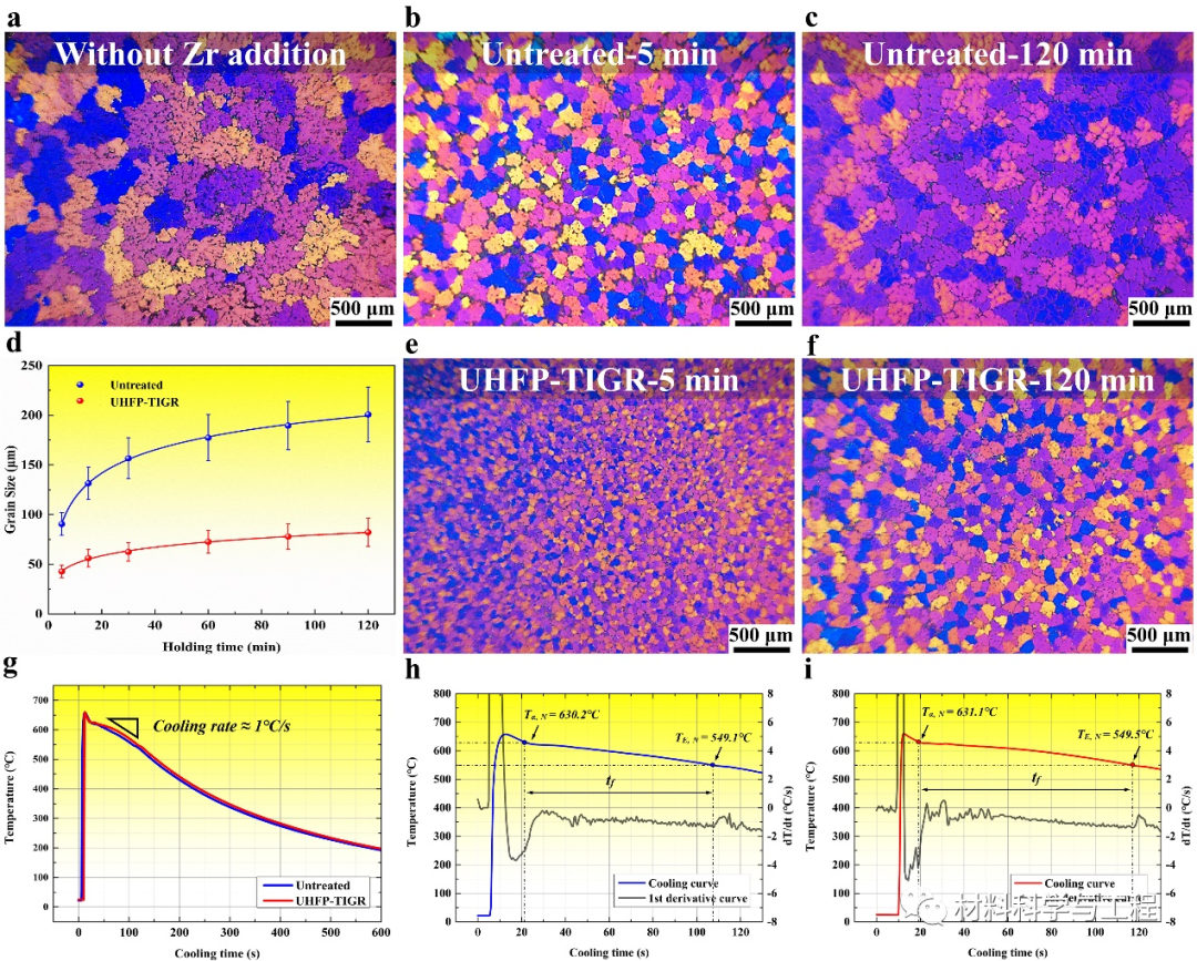 图3 预处理前后Mg-Zr中间合金的晶粒细化效果及对合金凝固行为的影响规律