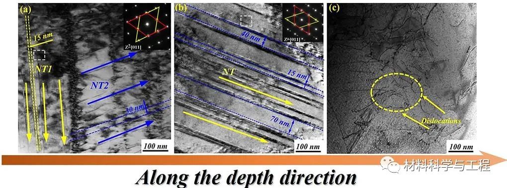 图4.四次LSP处理后的HEA合金样品在不同深度方向上的微观组织结构的TEM明场像:(a)50 mm深度处的双向NTs;(b) 150 mm深度的单向NTs;(c)300mm深度的位错线。