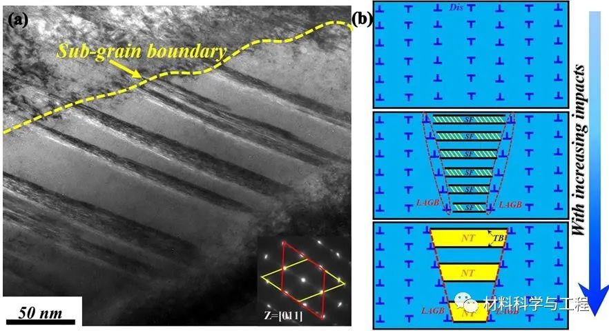 图6.四次LSP处理后CrFeCoNiMn0.75Cu0.25HEA的结构特征: (a)孪晶及亚晶界明场图像,(b)在LSP过程中亚晶界形成的示意图