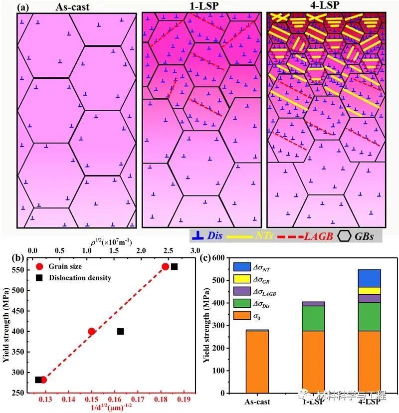 图7.(a) 铸态、一次LSP和四次LSP处理后的HEAs强化机制示意图;(b)屈服强度与晶粒尺寸和位错密度的曲线图;(c)LSP处理前后CrFeCoNiMn0.75Cu0.25HEA试样的屈服强度增量柱状图
