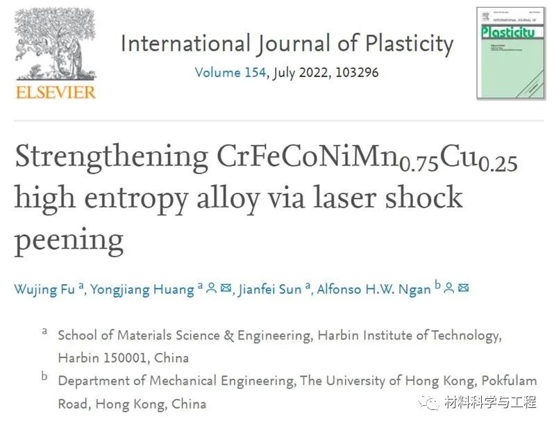 基于此,哈尔滨工业大学材料科学与工程学院的黄永江团队与英国皇家工程院院士、香港大学颜庆云教授(A.H.W. Ngan)合作,将LSP应用于一种新型的低层错能的高熵合金(CrFeCoNiMn0.75Cu0.25HEA),并详细探究了LSP对于该合金微观组织结构的影响机制,尤其是其纳米/微米尺度上的结构演变规律,并探明LSP对于这种新型合金材料的宏观拉伸性能的影响机制。相关研究成果以题“Strengthening CrFeCoNiMn0.75Cu0.25 high entropy alloy via laser shock peening”发表于材料力学顶级期刊International Journal of Plasticity。