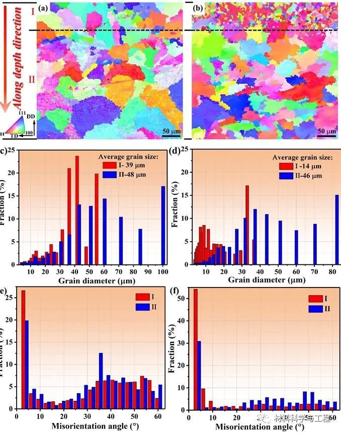 图3.(a, c, e)一次以及(b, d, f)四次LSP处理后的CrFeCoNiMn0.75Cu0.25HEA截面的EBSD图谱:(a)、(b)晶粒形貌,(c)、(d)晶粒尺寸统计和(e)、(f)取向差角;图3a和3b分别所示为I区(深度为~80 mm时)和II区对应于试样中不同深度的区域。