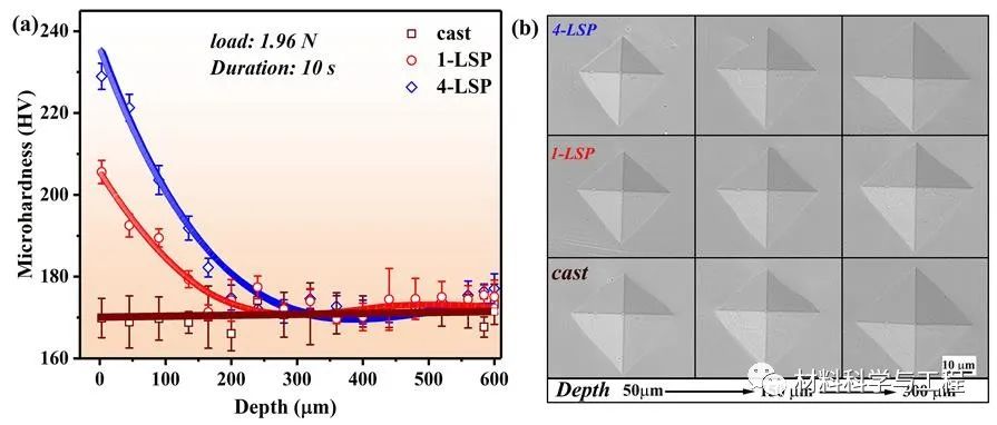 图2.LSP处理前后的合金试样在不同深度下的(a) 显微硬度值及 (b) 压痕形貌
